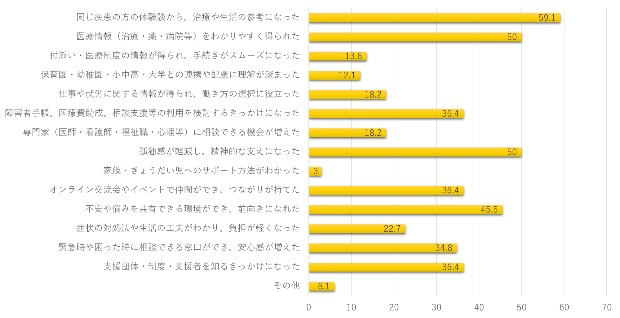 「その他」のご回答:「学校や職場などへの周囲の理解が得やすくなった」「同じ病の人がいるという安心感」「最近入会したばかりでまだわかっていません」