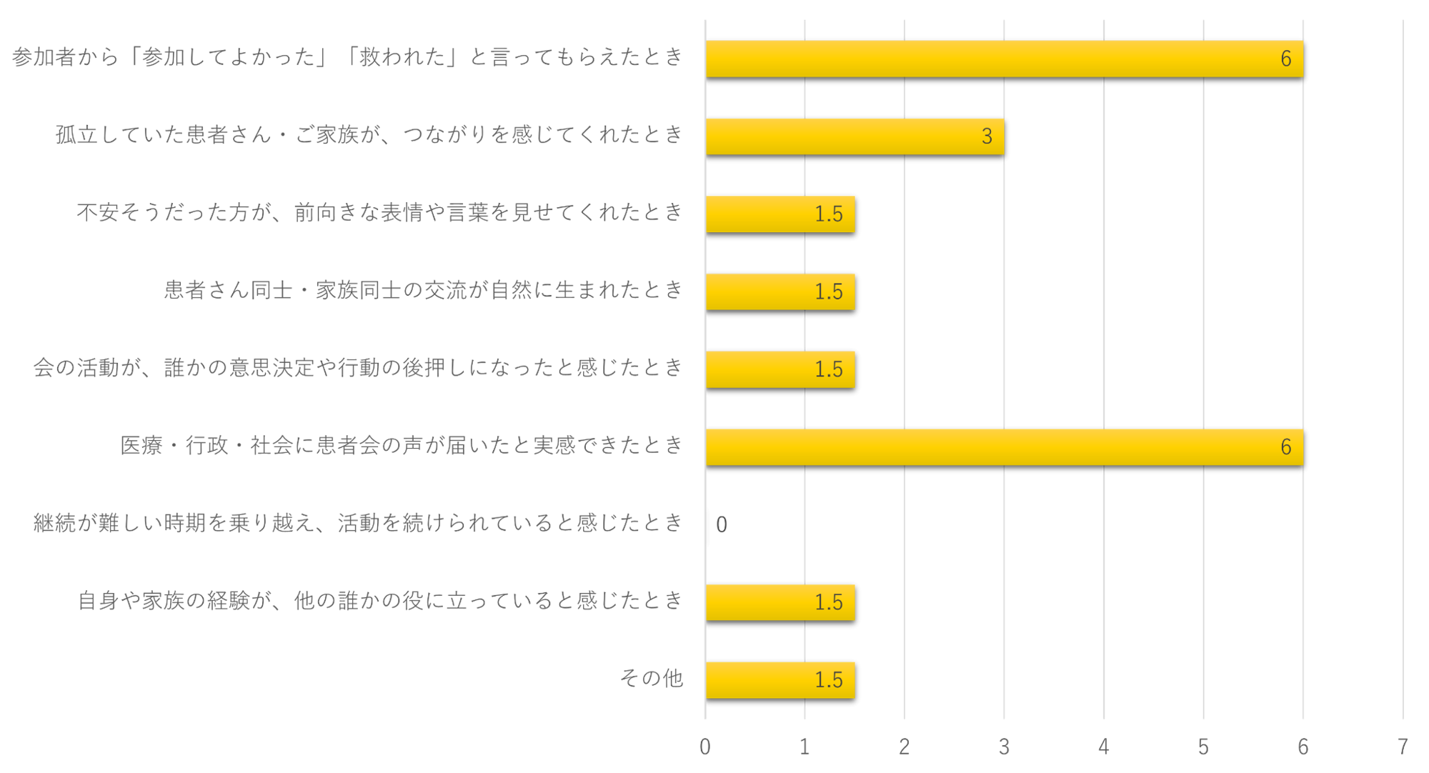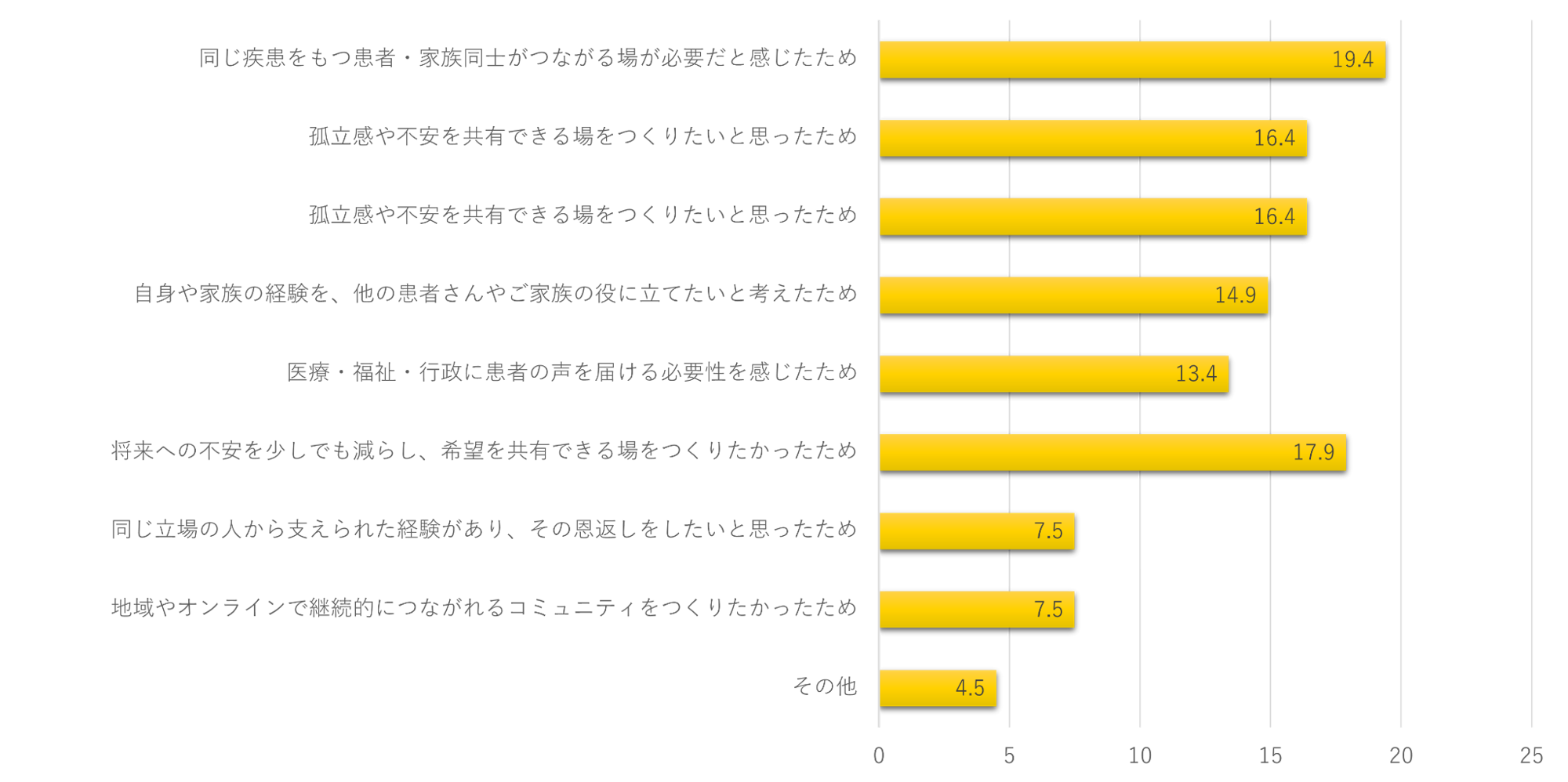 「その他」のご回答:「発足のきっかけが、病気を研究してくださっている先生方からのお話しでした。その話の中で、患者会は患者関係者だけの内向きなものではなく、患者会から社会に働きかける事により出来ることが大きく広がるのだと感じ患者会の発足に至りました。」「治療薬を日本に導入するため」「育児と仕事の両立を続けていくために必要な支援策を訴え、共感していく輪を広げたかった。そうした家族がいることを社会に見える化していく必要を感じたから。」