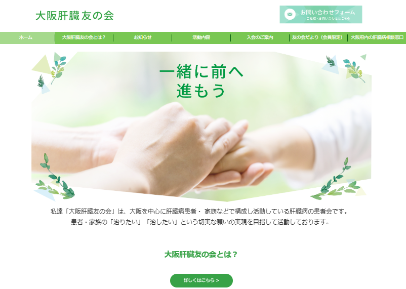 やはり今の時代、ホームページ(電子媒体による発信)の効果は絶大です。閲覧数も徐々に増え、問い合わせ・質問も定期的に来るようになりました。通常なら新しいホームページを立ち上げする場合は、それなりの費用がかかりますが、信じられない位リーズナブルでした。『アイ・モバイル株式会社』様と出会えたことは、私達大阪肝臓友の会にとって、最大最高の幸運だったことは間違いありません。尊敬、信頼、感謝の気持ちでいっぱいでございます。『アイ・モバイル株式会社』様のことは、私達みんないつもとても誉めていらっしゃいます。